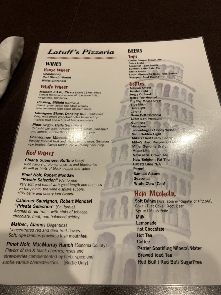 Introducing Latuff's Pizzeria, a beloved Italian restaurant serving up a delectable menu of pizzas, burgers, and other mouthwatering dishes. Located in Plymouth, MN, Latuff's offers a plethora of amenities including wheelchair accessibility, outdoor seating, and full bar service. Their menu boasts appetizers like Garlic Bread and Meatball Dip, salads like Chefs Salad and Greek Salad, and a variety of specialty pizzas such as the Italian Favorite and BBQ Chicken. Customers rave about the authentic flavors and generous toppings, with highlights including the shrimp pizza and lasagna. With a long-standing history since 1971, Latuff's is a must-visit spot for delicious Italian cuisine and a cozy dining experience.